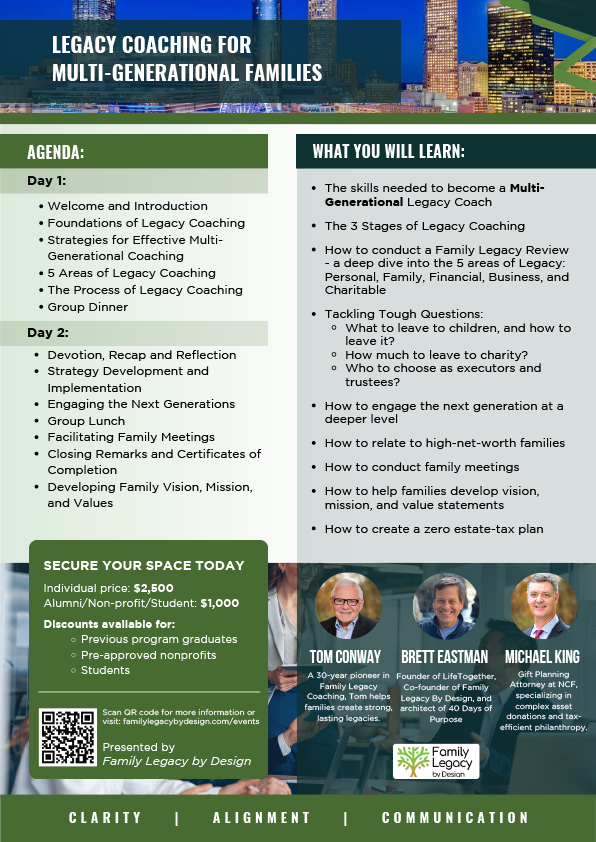 Join Tom Conway for two days of intensive training and networking. Learn to implement successful coaching strategies with your clients and help them think through their legacies in deep and meaningful ways.